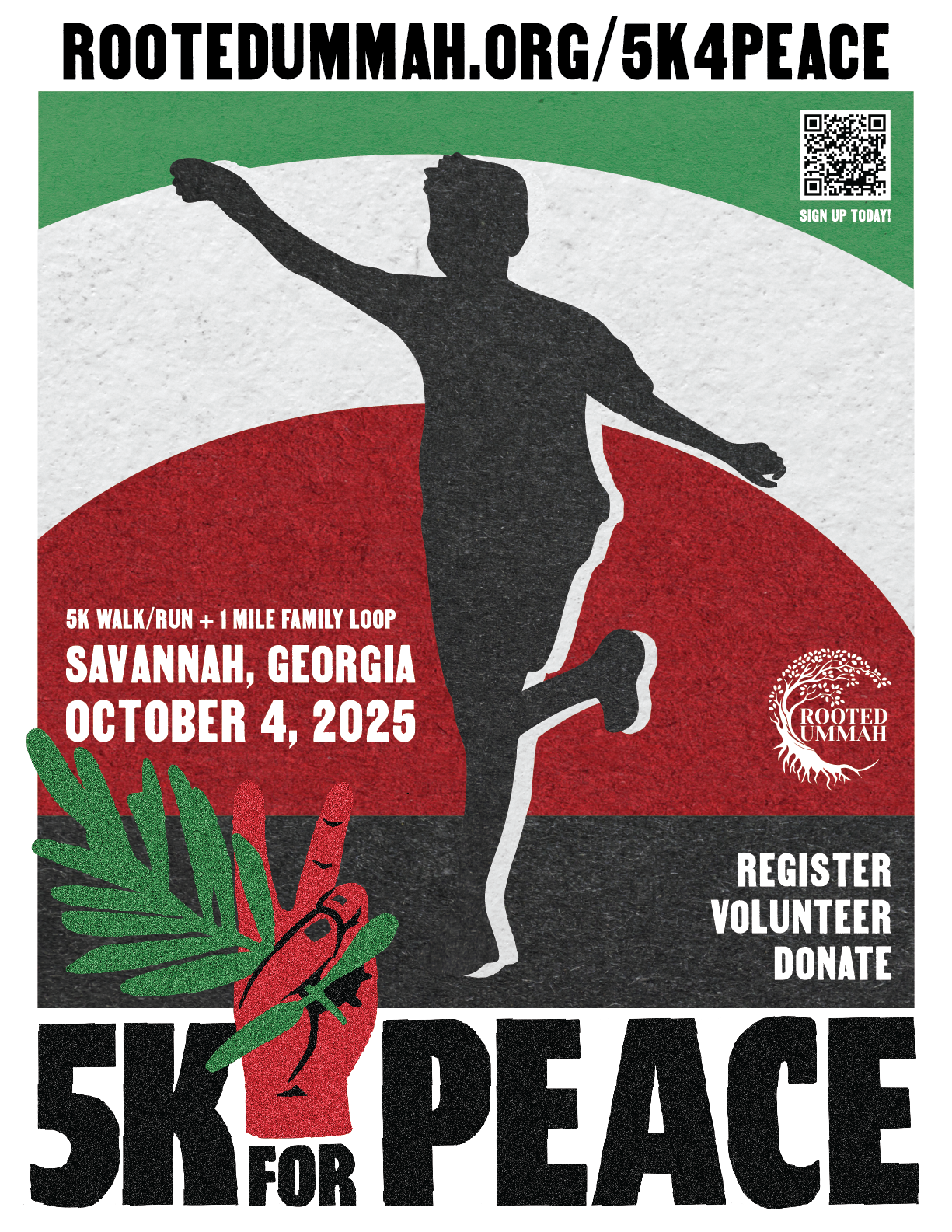 Registration is open now through October 3rd and includes a race bib, pin, and access to post race community celebration! Participants are encouraged to register at rootedummah.org/5k4peace.