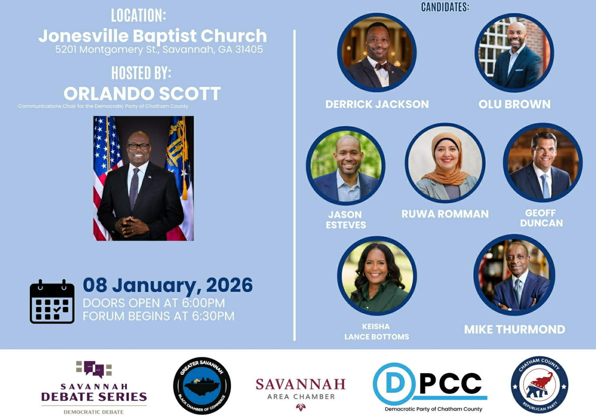 THE Democratic Party of Chatham County will be hosting The Georgia Democratic Gubernatorial Forum on Thursday, January 8, 2026 at Jonesville Baptist Church, 5201 Montgomery Street.