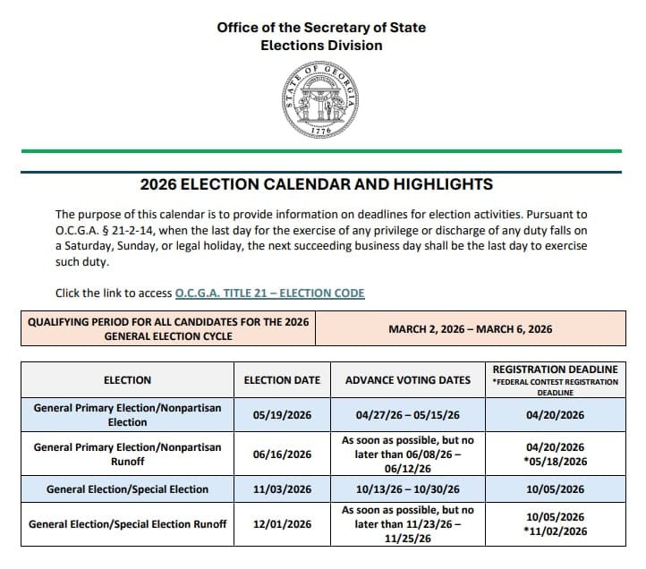 The general election is on Tuesday, November 3, 2026 - with early voting starting on October 13th.