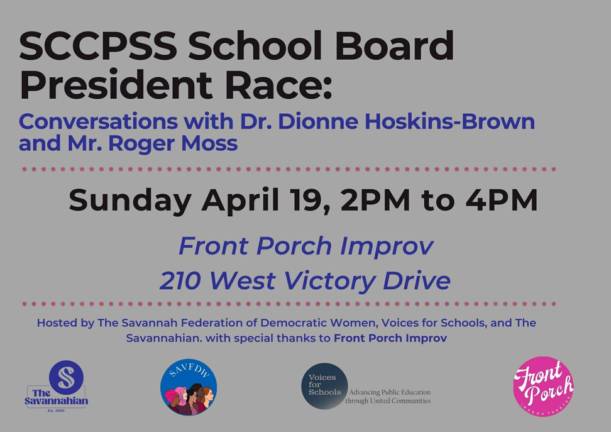 VOICES FOR SCHOOLS and Savannah Federation of Democratic Women are hosting a forum on Sunday, April 19 at Front Porch Improv to highlight the two candidates running for Savannah-Chatham County School Board President, Dr. Dionne Hoskins-Brown and incumbent President Roger Moss.