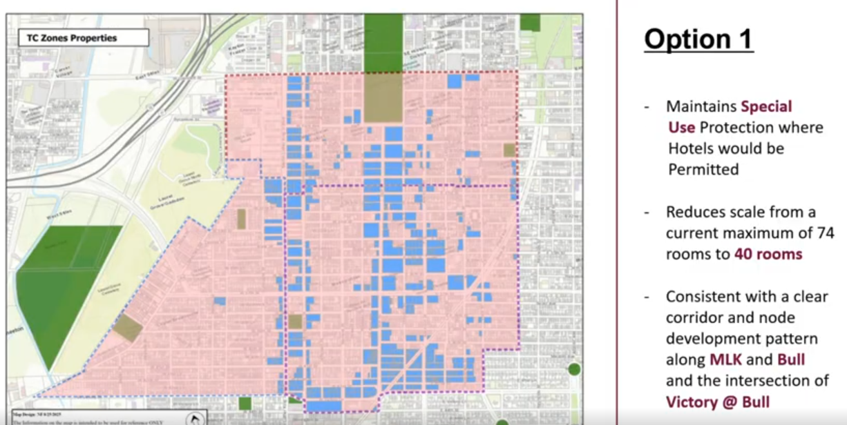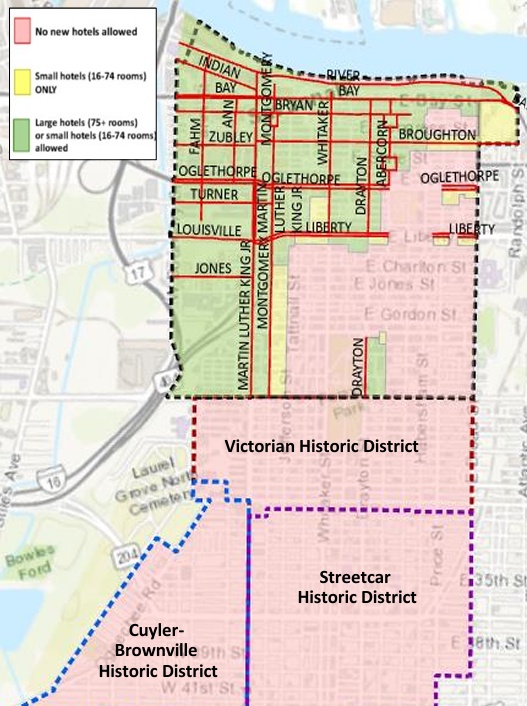 In simple terms, it would essentially ban any new hotel construction larger than the small-inn status of 15 rooms, in most parts of Savannah north of Victory Drive.